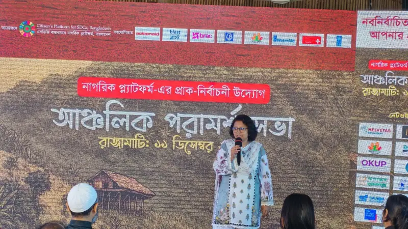 চলমান সংস্কার, বিচার ও নির্বাচনী প্রক্রিয়ার আলোচনায় ও বিতর্কে পিছিয়ে পড়া বা সুবিধা বঞ্চিত জনগোষ্ঠীর স্বার্থ ও প্রত্যাশা তুলে ধরতে এবং তাদের সক্রিয় অংশ নিশ্চিত করতে নাগরিক প্ল্যাটফর্ম নাগরিক ইশতেহার প্রস্তুত প্রক্রিয়ার অংশ হিসেবে রাঙ্গামাটিতে নাগরিক প্লাটফর্মের প্রাক নির্বাচনী উদ্যোগ আঞ্চলিক পরামর্শ সভা অনুষ্ঠিত হয়েছে। বৃহস্পতিবার (১১ ডিসেম্বর) সকাল ১১ টায় রাঙ্গামাটি কাপ্তাই সড়কের বার্গী লেক ভ্যালিতে এসডিজি বাস্তবায়নে নাগরিক প্ল্যাটফর্ম বাংলাদেশ এই সভার আয়োজন করে।