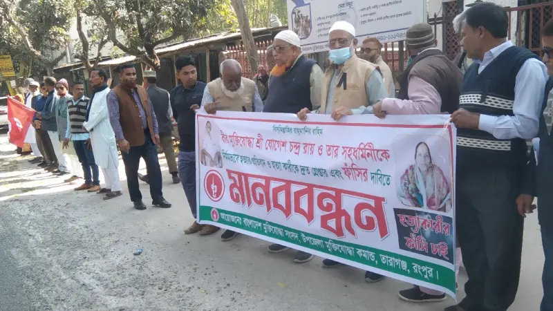 রংপুরের তারাগঞ্জ উপজেলায় সাবেক প্রধান শিক্ষক ও মুক্তিযোদ্ধা যোগেশ চন্দ্র রায় ও তার স্ত্রীকে হত্যার সঙ্গে জড়িতদের দ্রুত গ্রেপ্তার করে বিচারের দাবিতে মানববন্ধন করেছেন মুক্তিযোদ্ধারা।