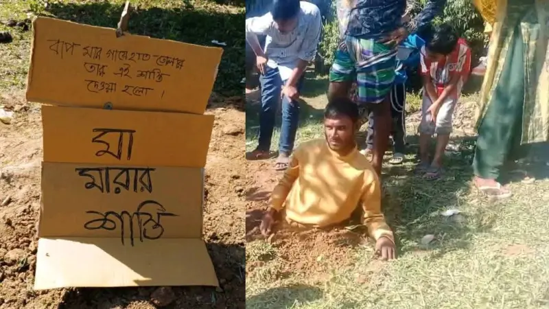 গাজীপুরের শ্রীপুরে মাদকাসক্ত ছেলের লাগাতার নির্যাতনে অতিষ্ঠ হয়ে এক অসহায় মা প্রতিবেশীদের কাছে বিচার চান। পরে ক্ষুব্ধ এলাকাবাসী ওই যুবককে আটক করে মারধর করে এবং শাস্তিস্বরূপ কোমর পর্যন্ত মাটিতে পুঁতে রাখে।
