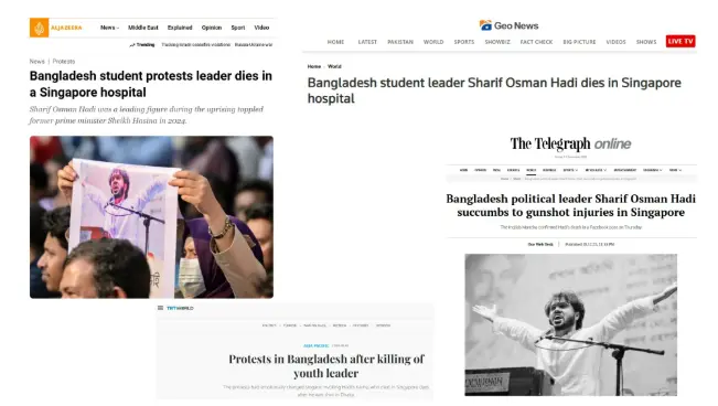 ইনকিলাব মঞ্চের মুখপাত্র শরিফ ওসমান হাদি চিকিৎসাধীন অবস্থায় সিঙ্গাপুর জেনারেল হাসপাতালে মারা গেছেন। তার মৃত্যুতে দেশজুড়ে নেমে এসেছে শোকের ছায়া। স্থানীয় সংবাদমাধ্যমের পাশাপাশি হাদির মৃত্যর খবর গুরুত্ব দিয়ে প্রকাশ করেছে আন্তর্জাতিক বিভিন্ন গণমাধ্যম।
