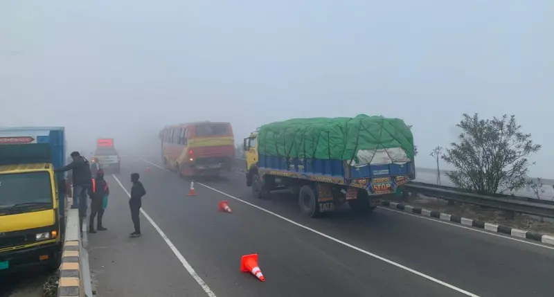 প্রত্যক্ষদর্শীরা জানান, তীব্র কুয়াশায় দৃশ্যমানতা কম থাকায় নিয়ন্ত্রণ হারিয়ে পেছন দিক থেকে যানগুলো পরপর সংঘর্ষে জড়িয়ে পড়ে। খবর পেয়ে হাঁসাড়া হাইওয়ে পুলিশের সদস্যরা দ্রুত ঘটনাস্থলে পৌঁছে উদ্ধার কার্যক্রম শুরু করেন। দুর্ঘটনার পর প্রায় আধা ঘণ্টা এক্সপ্রেসওয়েতে যান চলাচল ব্যাহত হয়।