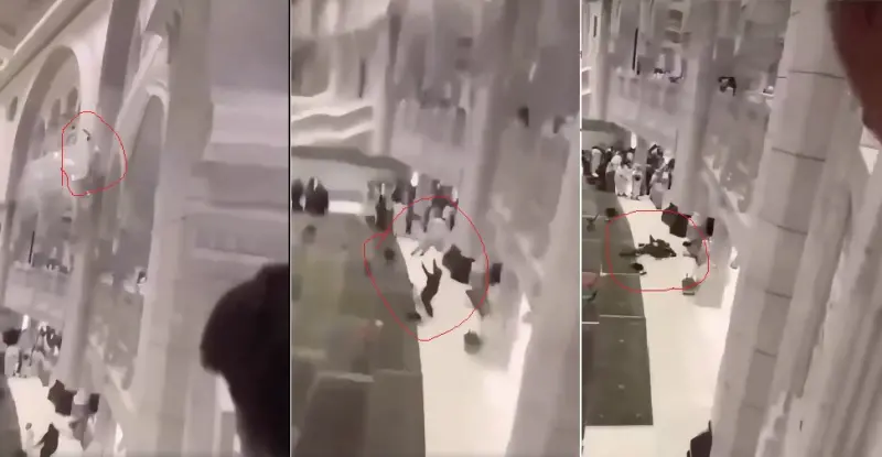 ভিডিওতে দেখা যায়, ওই ব্যক্তি মসজিদ কমপ্লেক্সের ওপরে ৩ তলা থেকে লাফ দেওয়ার চেষ্টা করেন। এ সময় নিরাপত্তা কর্মীরা তাকে থামাতে এগিয়ে যান। তাকে আটকাতে গিয়ে এক নিরাপত্তা কর্মকর্তা আহত হন।