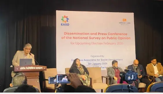 বেসরকারি সংস্থা এমিনেন্স অ্যাসোসিয়েটস ফর সোশ্যাল ডেভেলপমেন্ট (ইএএসডি) এই জনমত জরিপ চালায়। সোমবার (০৫ জানুয়ারি) বিকেলে রাজধানীর ফার্মগেটে কেআইবি মিলনায়তনে জরিপের ফল তুলে ধরেন ইএএসডির প্রধান নির্বাহী কর্মকর্তা শামীম হায়দার তালুকদার।