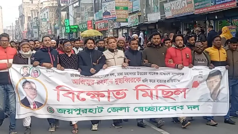 ঢাকা মহানগর উত্তর স্বেচ্ছাসেবক দলের সাবেক সাধারণ সম্পাদক আজিজুর রহমান মুসাব্বিরকে গুলি করে হত্যার প্রতিবাদে জয়পুরহাটে বিক্ষোভ মিছিল করেছে জেলা সেচ্ছাসেবক দল। শনিবার (১০ জানুয়ারি) বিকেলে জেলা বিএনপির কার্যালয় থেকে মিছাল বের করে শহরের প্রধান সড়ক প্রদক্ষিণ শেষে আবার সেখানে গিয়ে শেষ হয়। পরে সেখানে বক্তব্য দেন, জেলা স্বেচ্ছাসেবক দলের আহ্বায়ক আলমগীর হোসেন, যুগ্ম আহ্বায়ক জহুরুল ইসলাম, তৈয়বুর রেজা, মোমিন খন্দকার ডালিম ও সদস্য সচিব শামস মতিন প্রমুখ।