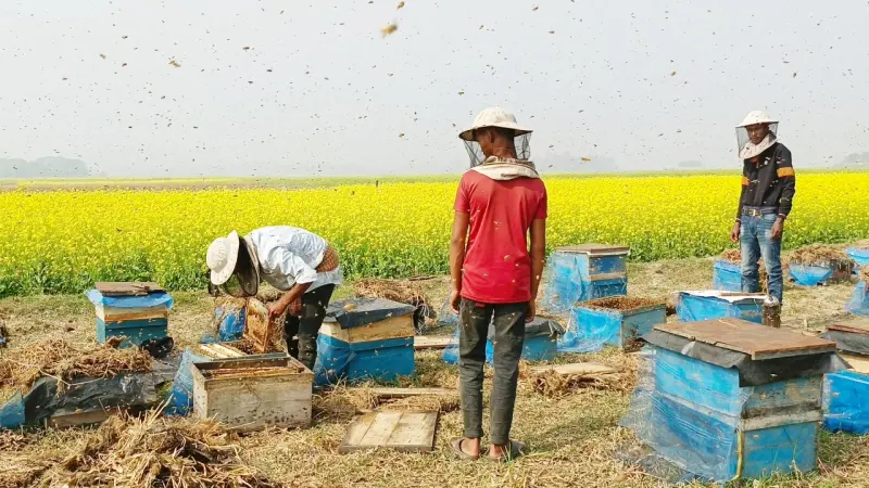 কিশোরগঞ্জের ভৈরবে সরিষার হলুদ ফুলে ভরে উঠেছে বিস্তীর্ণ মাঠ। সরিষার আবাদকে ঘিরে মৌমাছির বাক্স বসিয়ে মধু সংগ্রহে ব্যস্ত সময় পার করছেন চাষি ও মধু সংগ্রহকারীরা। তবে আবহাওয়া অনুকূলে না থাকায় এ বছর প্রত্যাশামতো মধু পাওয়া যাচ্ছে না বলে জানিয়েছেন সংশ্লিষ্টরা।