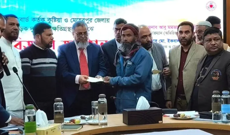 বৃহস্পতিবার (১৫ জানুয়ারি) দুপুরে বাংলাদেশ সড়ক পরিবহন কর্তৃপক্ষের (বিআরটিএ) ট্রাস্টি বোর্ডের উদ্যোগে কুষ্টিয়া ও মেহেরপুরে সড়ক দুর্ঘটনায় ক্ষতিগ্রস্তদের মাঝে দুই কোটি ৮০ লাখ টাকার চেক বিতরণ করা হয়।