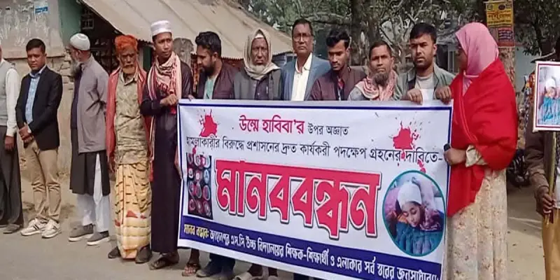 নওগাঁর ধামইরহাটে রাতের আঁধারে নিজ ঘরে দুর্বৃত্তের হামলায় নিহত মেধাবী শিক্ষার্থী উম্মে হাবিবা (১৭) হত্যার ঘটনায় জড়িতদের দ্রুত গ্রেপ্তার ও দৃষ্টান্তমূলক শাস্তির দাবিতে মানববন্ধন অনুষ্ঠিত হয়েছে।
