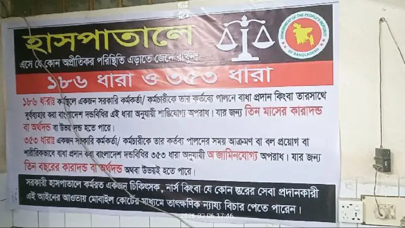 প্যানাটিতে হাসপাতাল সংশ্লিষ্ট আইনগত বিধান তুলে ধরে বলা হয়—হাসপাতালে এসে কোনো অপ্রীতিকর পরিস্থিতি এড়াতে বাংলাদেশ দণ্ডবিধির ১৮৬ ও ৩৫৩ ধারার বিষয়ে সচেতন থাকতে হবে।